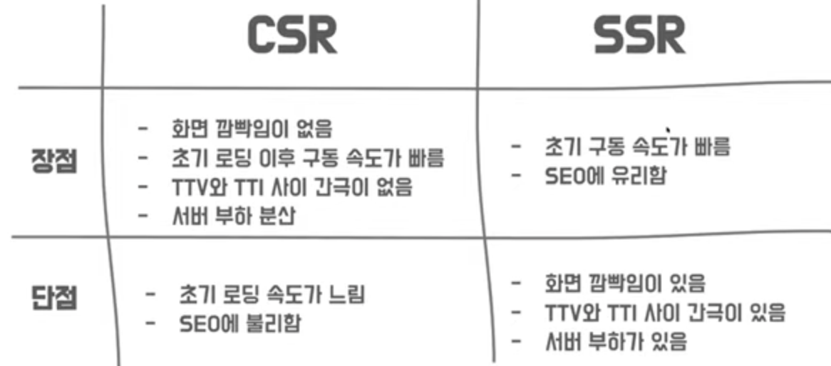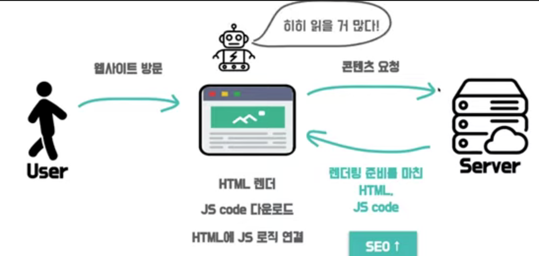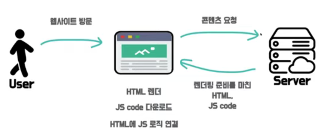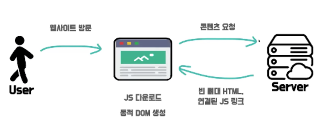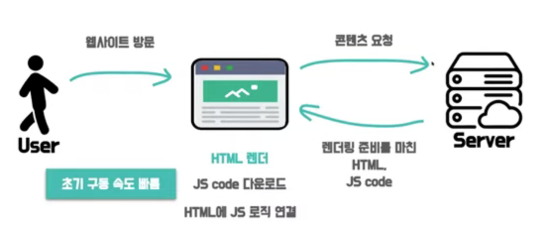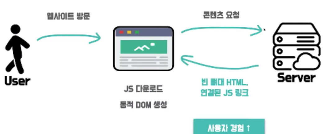 - 즉, 브라우저가 javascript 코드를 가지고 있지 않거나, 요청 중인 상태라면 UI를 구성할 수 없고, 유저는 빈 화면을 보게 된다. 코드가 실행되기 전까지는 유저 화면에 아무것도 보이지 않는 것이다. 이렇게 클라이언트 측에서 UI를 빌드하는 것 을 CSR 방식이라 한다.