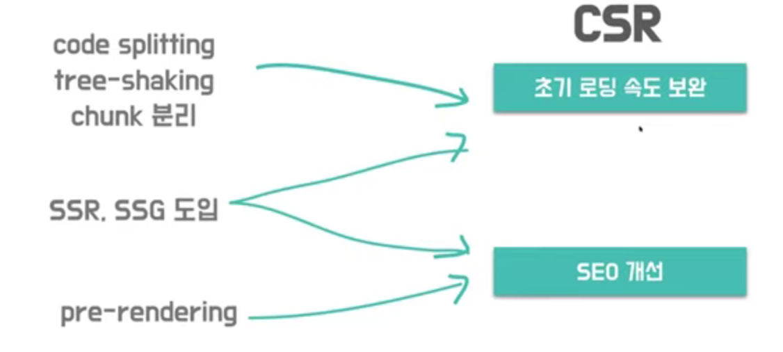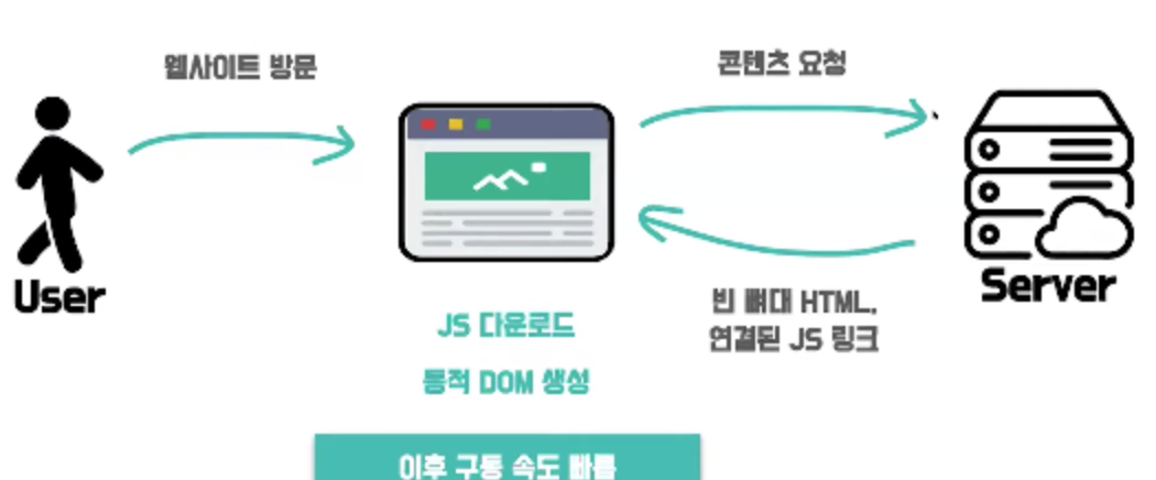 - JavaScript 파일을 번들링 해서 한 번에 받기 때문에 초기 구동 속도가 느리다. 맨 처음 url 요청에 웹문서가 가지고 있는 모든 정보, 링크페이지까지도 한 번에 다 받아온다. (Webpack의 code splitting, Chunking으로 해결 가능) - 브라우저가 js파일을 다운로드하고 동적으로 dom을 생성하는 시간을 기다려야 하기 때문에 (js파일 다운로드로 초기 진입속도가 느릴 수 있다.)