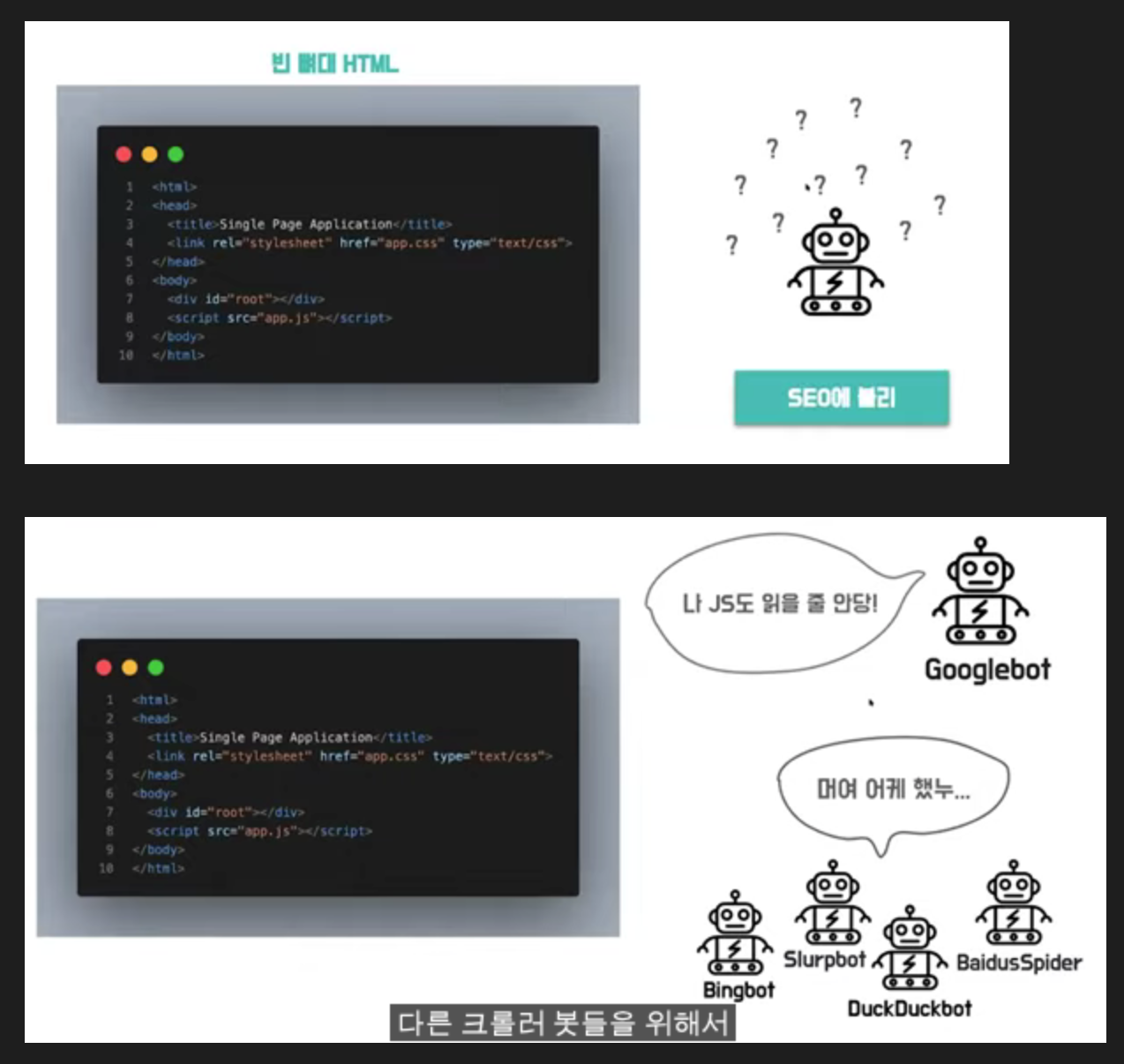 초기 HTML 파일이 비어있기 때문에 검색엔진이 색인을 할 만한 콘텐츠가 존재하지 않는 것이다.