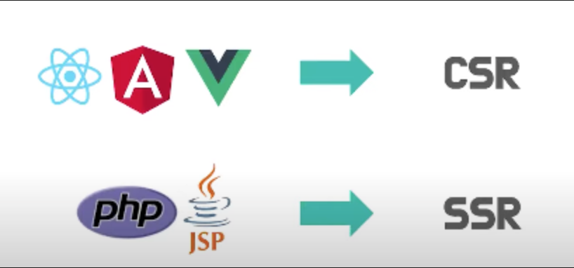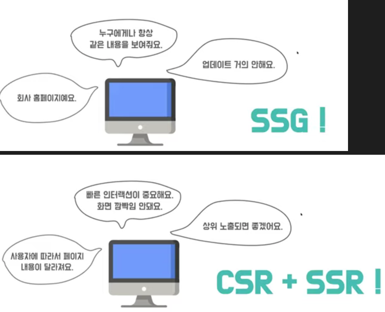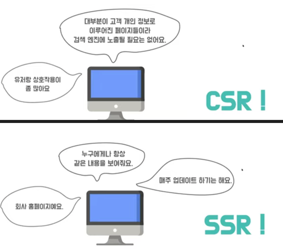 JS 코드 안에 있는 화면 랜더링 -> 당연히 클라이언트에서 작동(서버에서는 JS코드만 html 코드 안 가져오고 ) -> 첨에 다 무조건 CSR 씀
